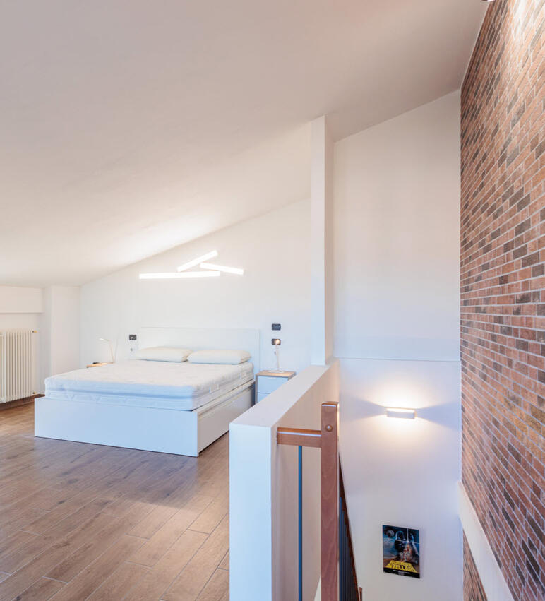 The project is a two-story apartment. The first floor features an open-plan layout, encompassing the entrance, kitchen, living room, access to the stairs, a bedroom, and a bathroom. The second floor includes a bedroom, a windowless storage room, and a bathroom.The client, L., is a young professional purchasing his first home. Living alone, he seeks a space that supports his social life while giving him the freedom to embrace this new chapter in his life.To meet these goals, we opened up the space on the first floor, allocating more room to the living and dining areas. A brick veneer wall was introduced to visually connect the two levels. The selected materials and color palette create a distinct ambiance for each floor: the first level features bold tones of black, dark grey, and red, while the upper floor softens with warmer hues of brown, white, and blue.